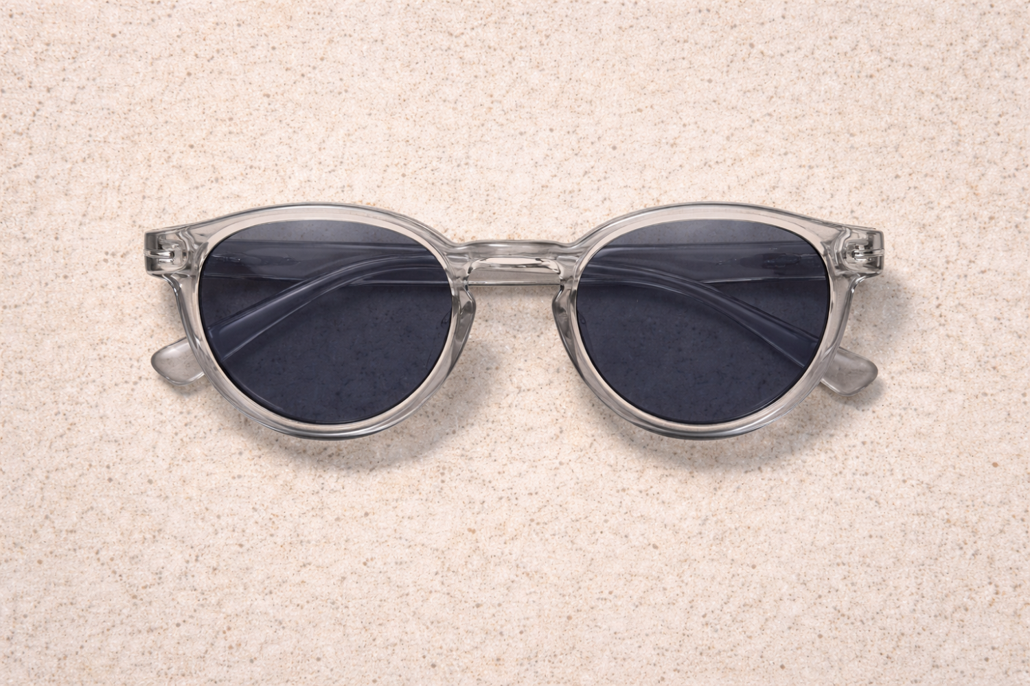 La main tient une élégante paire de lunettes de soleil PC en polycarbonate transparent sur fond de jeans.